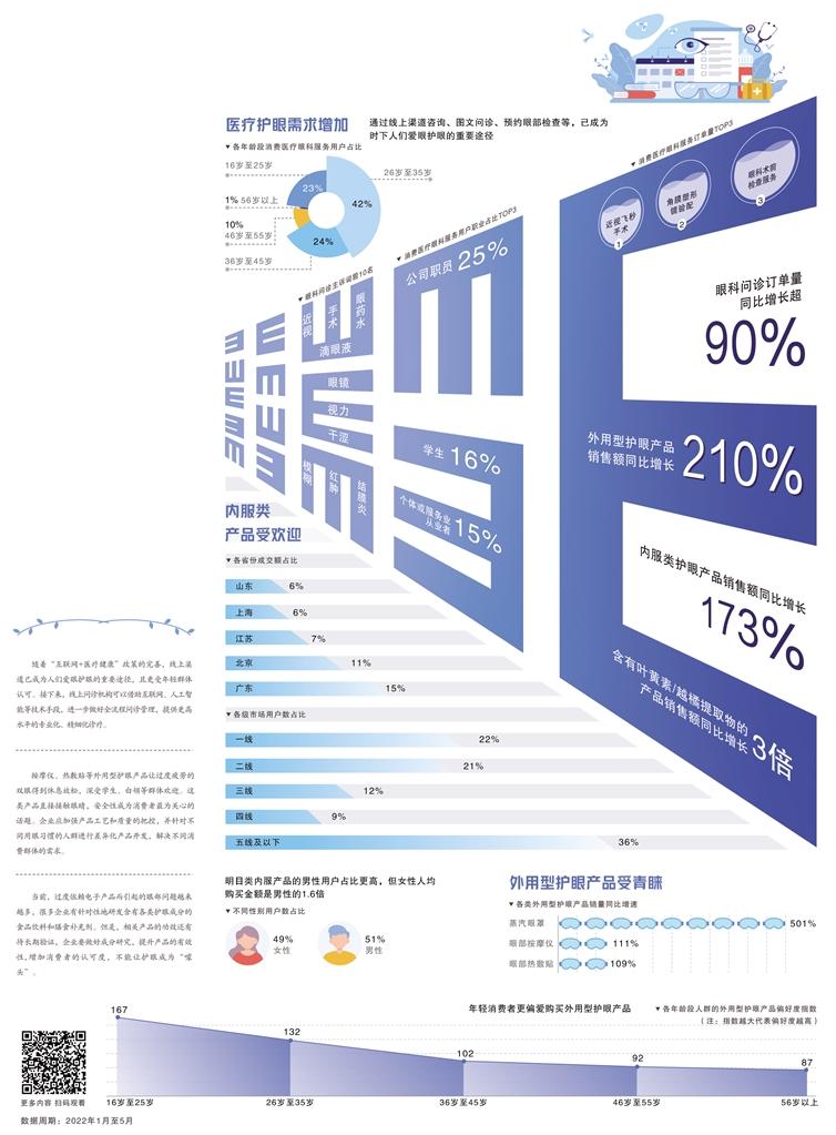 一方面,用户对更高质量、更专业化的眼部医疗和咨询服务的需求日益迫切。一个很明显的趋势是,眼科在线诊疗服务的用户群体已经从年轻人逐步发展到全年龄阶段,在线问诊的分诊作用和辅助作用正在得到进一步认可。相关机构可以借助互联网、人工智能等技术手段,更便利、更精准地做好患者的全流程问诊管理,为病患提供更高质量的服务。