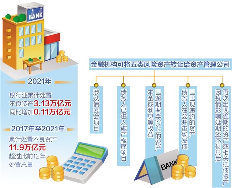 近年来,金融资产管理公司在化解风险方面的作用日益凸显。银保监会公开披露的信息显示,2021年,银行业累计处置不良资产3.13万亿元,同比增加0.11万亿元,再创历史新高。2017年至2021年,5年间累计处置不良资产11.9万亿元,超过此前12年处置总量。实践表明,处置不良资产能有效降低信用风险水平,积极稳妥处置不良资产是防范化解金融风险的有力举措。
