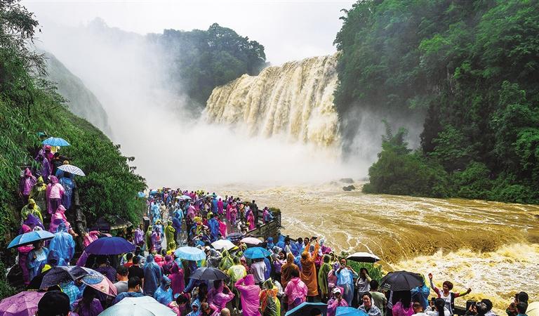 6月19日,位于贵州省安顺市的黄果树瀑布迎来今年入汛最大水量,水流飞泻而下,吸引了众多游客前来观景。邓 刚摄(中经视觉)