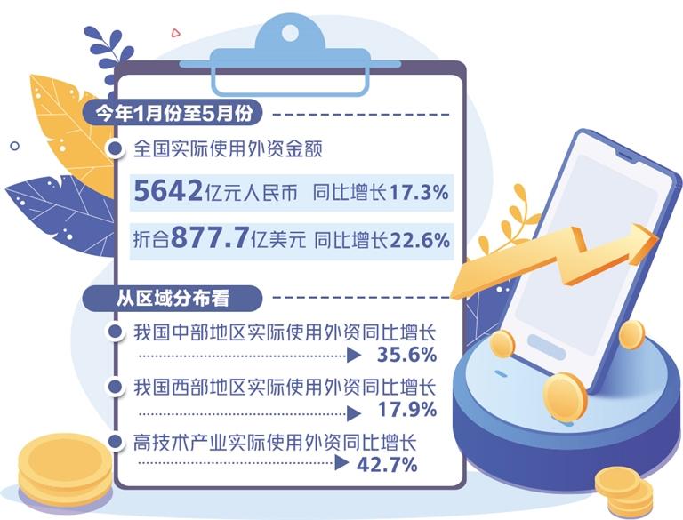 虽然受近期疫情多点散发影响,前5个月中国吸收外资同比增速有所下降,但也应看到,无论是从行业还是从来源地看,我国吸收外资都保持了较好态势。特别是高技术产业实际使用外资同比增长42.7%,仍保持了较高增长水平。