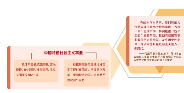 党的十九届六中全会通过的《中共中央关于党的百年奋斗重大成就和历史经验的决议》以“十个明确”对习近平新时代中国特色社会主义思想的核心内容作了系统概括,其中包括“明确中国特色社会主义事业总体布局是经济建设、政治建设、文化建设、社会建设、生态文明建设五位一体,战略布局是全面建设社会主义现代化国家、全面深化改革、全面依法治国、全面从严治党四个全面”。实现伟大梦想,必须推进伟大事业。明确中国特色社会主义事业总体布局是经济建设、政治建设、文化建设、社会建设、生态文明建设五位一体,体现了我们党对人类社会发展规律和中国特色社会主义建设规律的新认识。新时代新征程,我们要深刻把握中国特色社会主义事业总体布局,不断谱写中国特色社会主义事业发展新篇章。