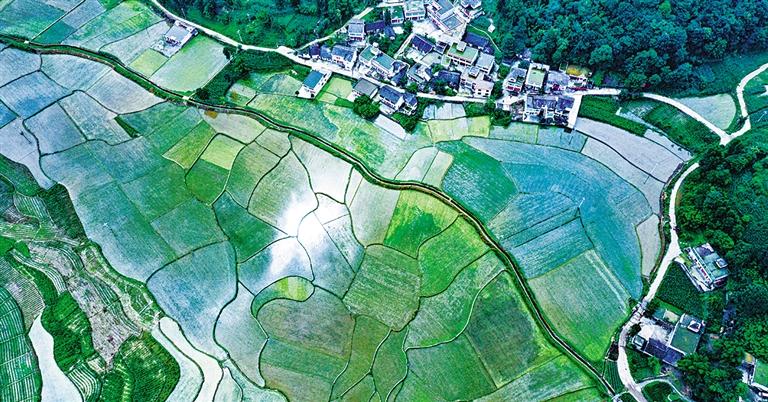 6月20日,贵州省黔西市锦星镇内庄,稻田、沟渠、村庄交相组成一幅美丽的夏日画卷。近年来,当地推进高标准农田建设,发放种粮补贴,提高粮食产量保丰收。胡 毅摄(中经视觉)