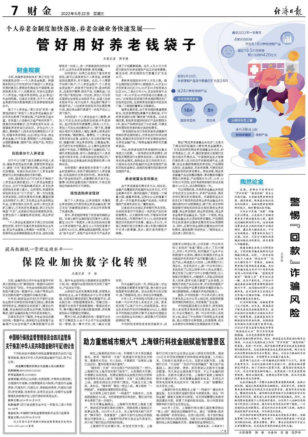 除了个人养老金,“第三支柱”的另一重要组成部分“其他个人商业养老金融业务”近年来也取得了快速发展,产品种类日益丰富。在我国人口老龄化日益严峻的形势下,提高自我保障意识、及早谋划老年生活、合理储备养老资金已成共识。多位业内人士建议,要根据个人财务状况统筹规划三个支柱,即基本养老保险、企业(职业)年金、商业养老金融;对于后者,要根据个人风险偏好,合理配置储蓄、理财产品、保险产品,有效分散风险。