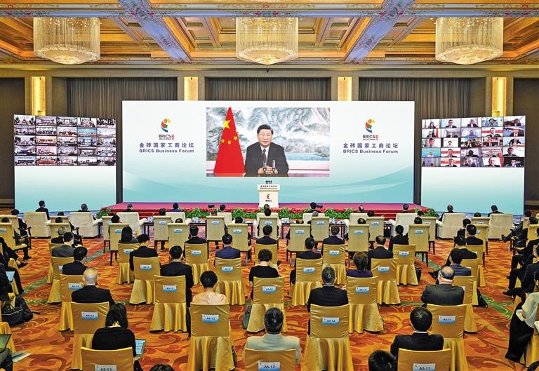 新华社北京6月22日电 6月22日晚,国家主席习近平以视频方式出席金砖国家工商论坛开幕式并发表题为《把握时代潮流 缔造光明未来》的主旨演讲。(演讲全文见二版)