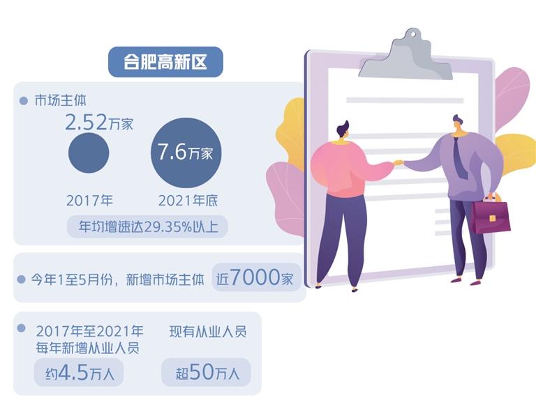记者了解到,合肥高新区市场主体从2017年的2.52万家发展到2021年底的7.6万家,年均增速达29.35%以上。今年1至5月份,新增市场主体近7000家。市场主体规模递增,相应带来了大量从业人员。该区2017年至2021年每年新增从业人员约4.5万人,现有从业人员超50万人,主要劳动年龄人口受过高等教育的比例达75%以上,35岁以下从业人员占比约65%。从市场主体增速和从业人员集聚的速度、规模、整体素质来看,合肥高新区已成为全国最具活力、最具影响力的创新创业集中区之一。