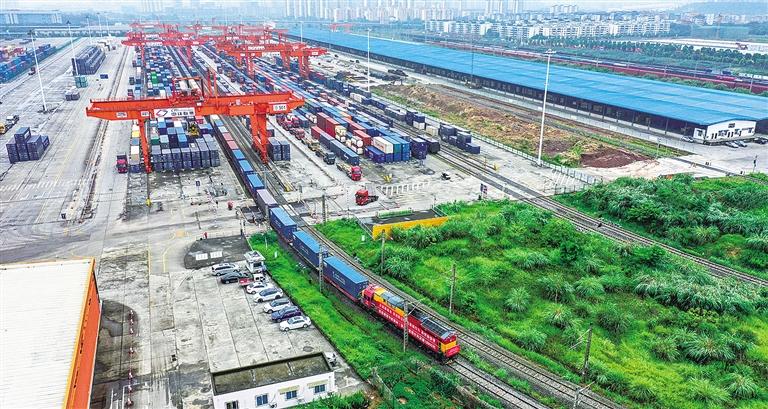 6月23日,中欧班列(重庆)第10000列列车在重庆团结村中心站顺利驶出,奔赴1万余公里外的德国杜伊斯堡(无人机照片)。重庆成为全国首个累计重箱折列开行量突破10000列的中欧班列开行城市。新华社记者 黄 伟摄