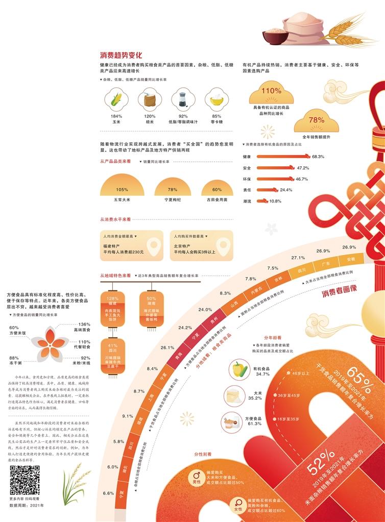另一方面,观察消费者采购米面杂粮等商品的消费习惯变化可以发现,大量用户最初在线上购买民生类产品的需求非常明确,就是“吃得更好”,其背后包含健康、营养、安全、口味等细分诉求。此后,随着线上消费习惯的养成,消费者会把更多品类的消费转移到线上,从而形成线上全品类消费拓展和升级。数据显示,健康已经成为消费者购买粮食类产品的首要因素,杂粮、低脂、低糖类产品迎来高速增长;有机产品持续热销,具备有机认证的商品品种同比增长110%,全年销售额提升78%。可以说,线上基础民生物资的消费增长成为我国市场消费升级的一个重要特征。
