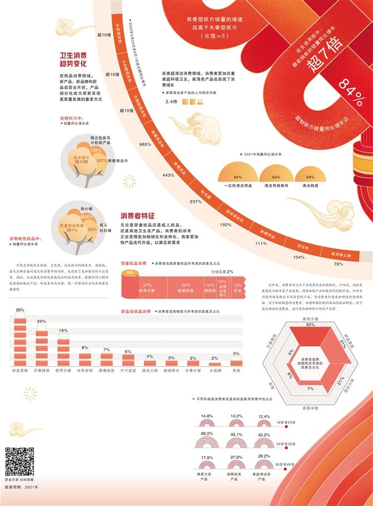 其一,纸类产品呈现出持续细分化趋势。从销量上看,消费者更加青睐含有亲肤类成分的纸品,相关产品销量增长明显;消毒、灭菌、护理类产品销量也实现稳步增长。同时,消费者在选择产品时也有了更多新诉求,如希望纸品能够更加坚韧,主打“超韧”的纸巾销量同比增长达84%;有香型纸巾的销量增速也远高于无香型纸巾。