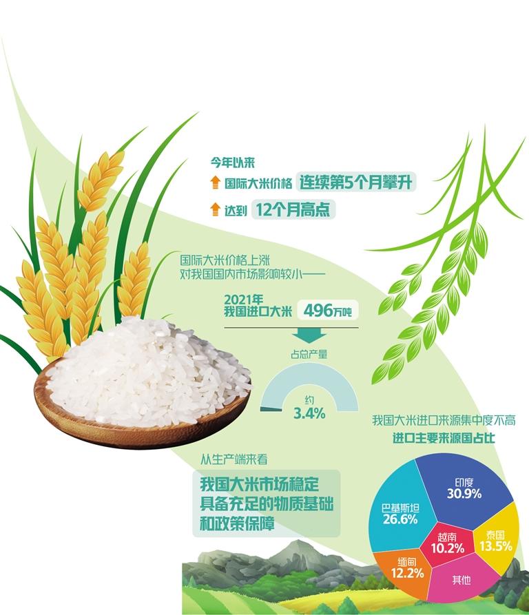 国际大米价格上涨对国内市场影响较小。我国虽然是世界第一大米进口国,但2021年也只进口了496万吨,仅占总产量约3.4%。而且,我国大米进口来源集中度并不高。据海关统计数据,2022年1月至4月累计,我国进口大米226万吨,进口主要来源国依次为:印度(占进口总量的30.9%)、巴基斯坦(占26.6%)、泰国(占13.5%)、缅甸(占12.2%)、越南(占10.2%)。因此,即使泰国大米价格继续上涨,我国大米进口商也可以更多转向从印度、巴基斯坦等国进口。