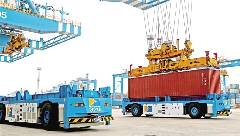 6月22日,在山东自贸试验区青岛片区,一辆辆自动导引车在运送货物。今年前5个月,山东省对金砖国家进出口额达1524.7亿元人民币,同比增长5.2%。 张进刚摄(中经视觉)