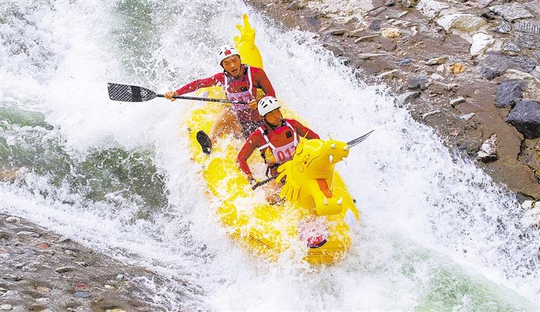 6月25日,2022年中国宜昌朝天吼自然水域漂流大赛在湖北省宜昌市兴山县开赛,来自全国的选手们搏浪飞舟,竞速漂流。近年来,朝天吼漂流景区累计完成固定资产投资5亿多元,形成了集水上娱乐、峡谷探险、赛车越野、游乐观光、研学拓展、康养度假、房车露营于一体的休闲旅游度假区。李 阳摄(中经视觉)