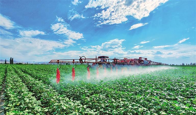 6月27日,新疆呼图壁县大丰镇大土古里村村民利用大型农机,为棉田喷洒防治病虫害的农药,做好棉花的田间管理。