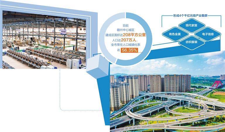 赣州以产业发展为核心,强练内功,不断增强经济实力、产业辐射带动力。随着中科院赣江创新研究院挂牌运行、中国稀土集团总部落户,赣州填补了江西无大院大所直属机构和央企总部的空白。今日赣州,着力打造“1+5+N”工业产业集群,形成了现代家居、有色金属、电子信息、纺织服装4个千亿元级产业集群,全市规模以上工业企业达2584家,高新技术企业达1067家,拥有国家稀土功能材料创新中心等一批国字号科研创新平台。近年来,赣州主要经济指标增速高于全国、全省平均水平,人均水平与全国、全省差距进一步缩小,2021年地区生产总值达4169.37亿元,是2011年的3.1倍,在全国城市中的排位由第108位跃升至第65位。