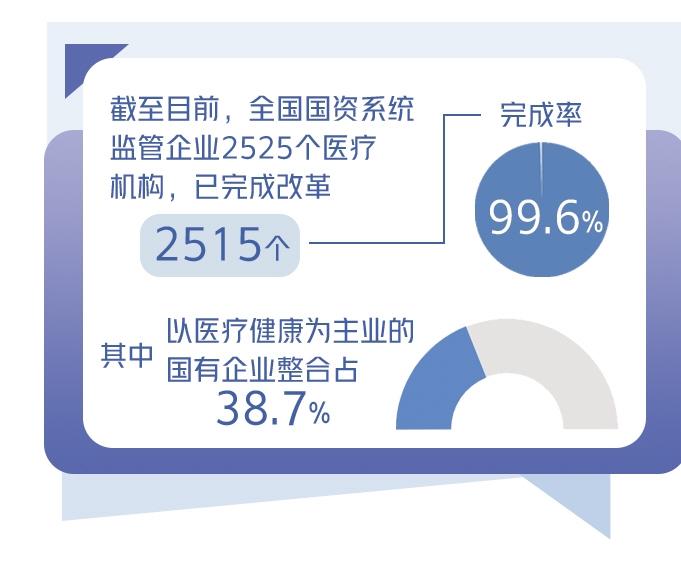 截至目前,全国国资系统监管企业2525个医疗机构(涉及职工21.7万人),已完成改革2515个,完成率99.6%。其中,移交地方政府506个,占20.0%;以医疗健康为主业的国有企业整合978个,占38.7%;引入社会资本改制440个,占17.4%;关闭撤销591个,占23.5%。