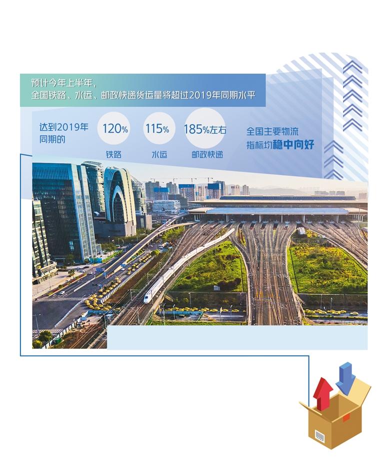 “6月24日全国高速公路货车流量达到了748万辆,比2019年同期增长18.3%。”赵冲久介绍,预计今年上半年全国铁路、水运、邮政快递货运量将超过2019年同期水平,分别达到2019年同期的120%、115%、185%左右。公路和民航也逐步恢复,货运量将分别达到2019年同期的93%和89%。