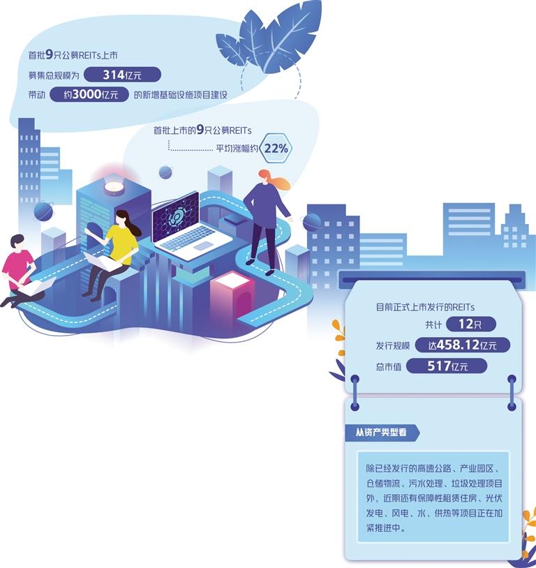 2021年6月21日,首批9只公募REITs上市募集总规模为314亿元,带动约3000亿元的新增基础设施项目建设。一年来,REITs在降低企业债务风险、盘活存量资产、形成投融资良性循环等方面的作用愈发凸显。未来如何鼓励更多优质成熟、资产类型丰富的项目入市?投资者如何参与投资?经济日报记者对此问题进行了采访。