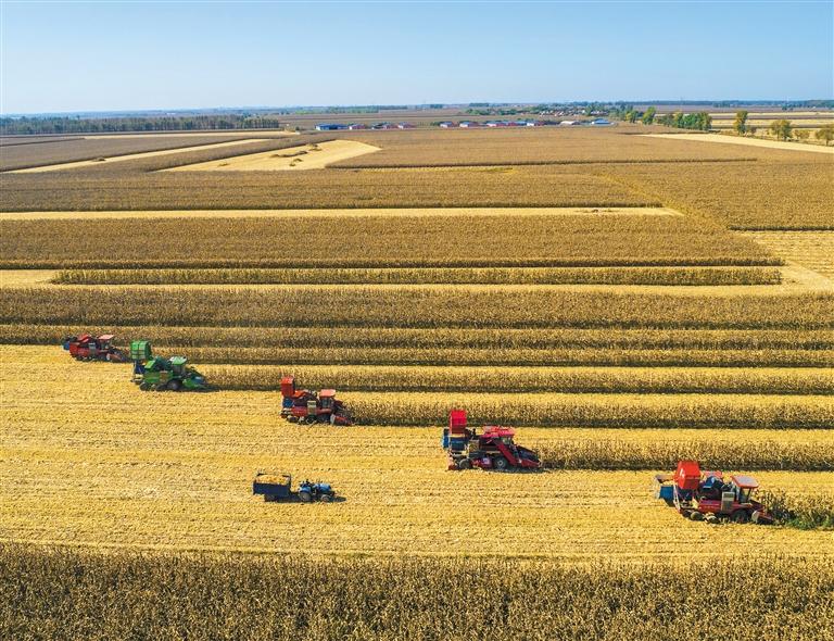 ▲四平市梨树县梨树镇高家村,农机在进行收割作业。“梨树模式”是吉林省经过多年实践,总结应用的黑土地保护技术模式,节本增产效果显著。邹志强摄(中经视觉)