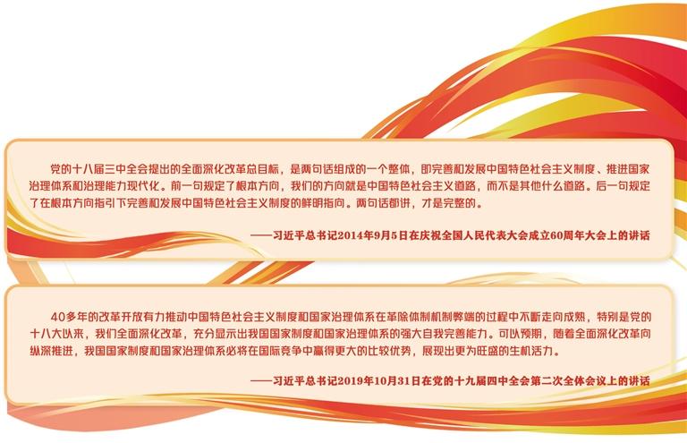 新中国成立后,中国共产党深入思考和探索怎样建设社会主义、怎样治理中国的问题。党的十一届三中全会拉开了改革开放的大幕,经过几十年的实践,社会主义中国的面貌发生了翻天覆地的变化。随着改革进入攻坚期和深水区,要继续前进,就必须敢于啃硬骨头、敢于涉险滩。在改革开放新的重要关头,党的十八届三中全会提出全面深化改革总目标。这个总目标是由两句话组成的一个严密整体,第一句话是“完善和发展中国特色社会主义制度”,规定了中国特色制度模式选择的根本方向,第二句话是“推进国家治理体系和治理能力现代化”,回答了在这个方向指引下国家制度和国家治理发展路径的鲜明指向。党的十九届四中全会着眼于党长期执政和国家长治久安,对坚持和完善中国特色社会主义制度、推进国家治理体系和治理能力现代化作出总体擘画,重点部署坚持和完善支撑中国特色社会主义制度的根本制度、基本制度、重要制度,从而进一步对怎样治理社会主义社会这个历史性课题作出科学回答,并为我国今后进一步治理社会主义社会实践提供根本遵循。我们要充分认识明确全面深化改革总目标在社会主义发展历史上的重大意义,进一步坚定中国特色社会主义道路自信、理论自信、制度自信、文化自信。