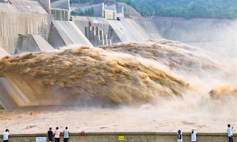 7月4日,河南济源,游客正观看黄河小浪底水库排沙出库。当日,黄河小浪底水库开始排沙,场面十分壮观。今年黄河调水调沙自6月19日开始实施,通过万家寨、三门峡和小浪底水库加大下泄流量,确保安全度汛。苗秋闹摄(中经视觉)