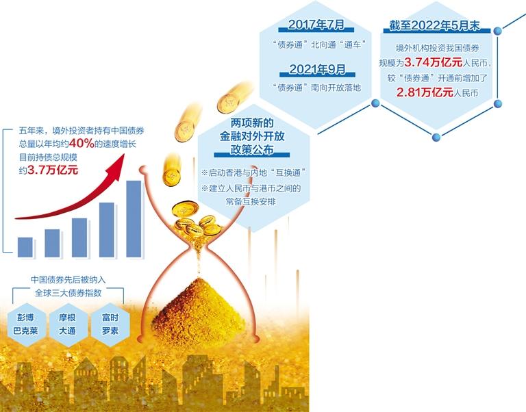 2017年7月,“债券通”北向通“通车”。2021年9月,“债券通”南向开放落地。截至2022年5月末,境外机构投资我国债券规模为3.74万亿元人民币,较“债券通”开通前增加了2.81万亿元人民币。
