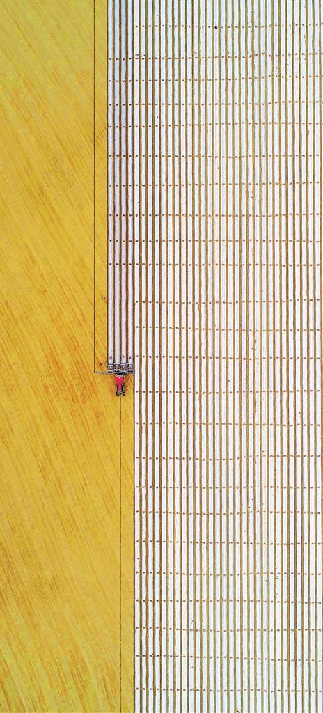 ▲新疆生产建设兵团第二师铁门关市二十九团,装有GPS卫星定位导航系统的大型播种机在播种棉花。田间“智慧农机”播种已在当地全面推广,通过一体作业大大提高农业效率。杜炳勋摄(中经视觉)