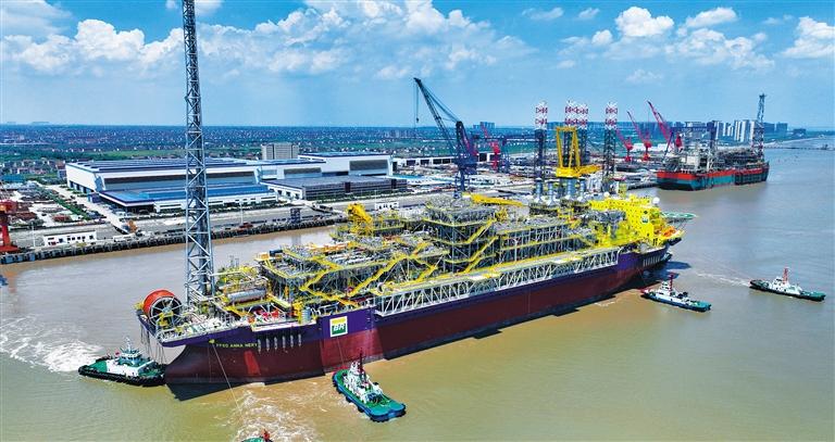 7月8日,由江苏启东中远海运海洋工程有限公司为马来西亚改装的大型浮式生产储卸油船“猎鹰”离开码头,前往浙江绿华山码头进行调试。“猎鹰”轮由一艘30万吨级超大型油轮改装而成,船总长333米,船底至甲板高度相当于10层楼。该船投运后可存储100万桶原油,堪称“海上油气工厂”。许丛军摄(中经视觉)