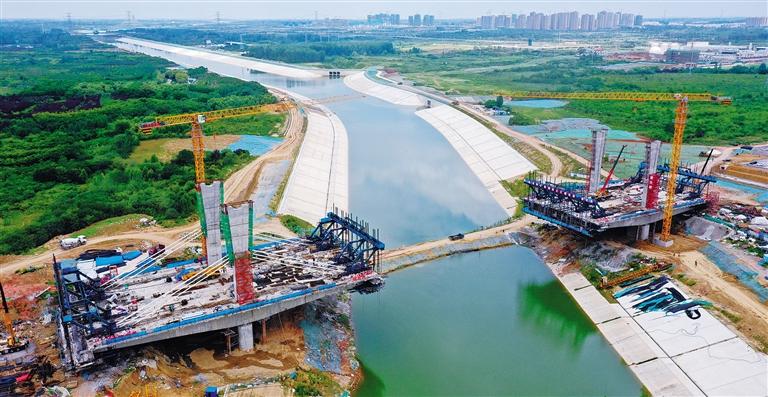 7月7日,建设者在引江济淮工程安徽省合肥市蜀山区段施工。引江济淮工程沟通长江、淮河两大水系,是跨流域、跨省的重大战略性水资源配置和综合利用工程,供水范围涉及安徽、河南两省55县(市、区),有望今年9月底试通水。陈三虎摄(中经视觉)