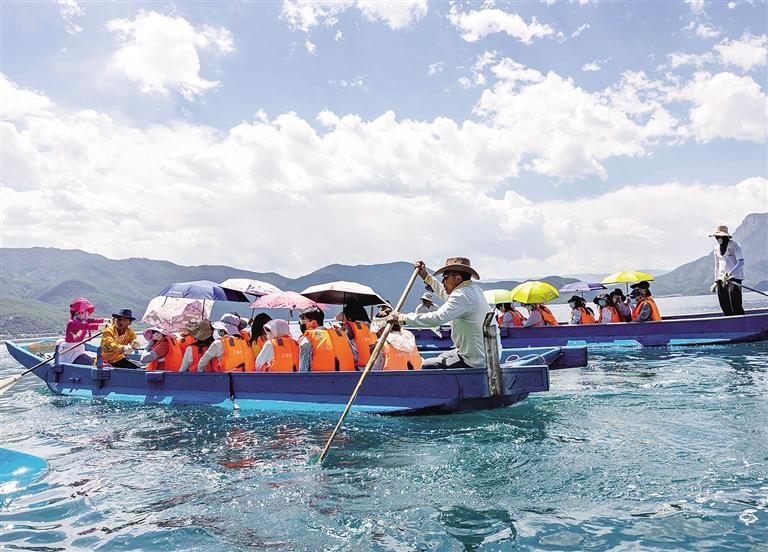 近日,游客乘船在云南宁蒗县境内泸沽湖里务比岛游览。泸沽湖湖面海拔2690米,面积约50平方公里,以美丽的湖光山色享誉中外。