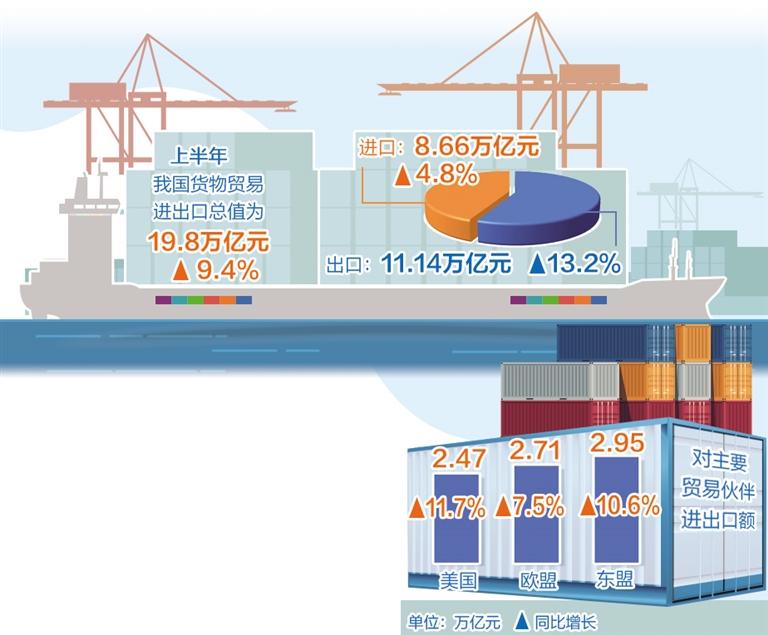 上半年,我国外贸进出口实现了稳步增长,连续8个季度同比正增长,为稳宏观经济大盘作出了积极贡献。据海关统计,上半年,我国货物贸易进出口总值为19.8万亿元,同比增长9.4%。其中,出口11.14万亿元,增长13.2%;进口8.66万亿元,增长4.8%。