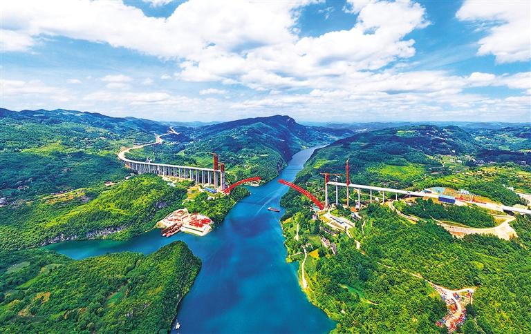 7月12日,位于贵州省铜仁市与遵义市交界处的德余高速乌江特大桥正在紧张建设中。该大桥位于贵州凤冈县、思南县、石阡县三地交界处,预计今年8月中旬完成合龙。