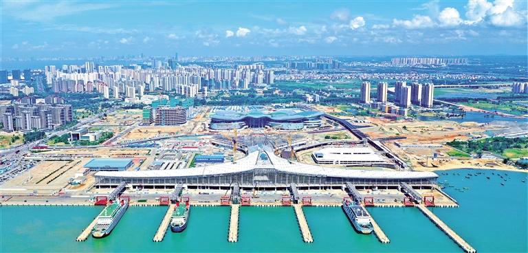 海南自贸港海口新海枢纽项目主体结构近日完成,正进行玻璃幕墙安装、金属屋面铺设等,预计今年底竣工,建成后将成为全国规模最大的港口客滚综合枢纽,打造海南自贸港的“门户港、形象港”,辐射带动周边旅游、文化和商业配套服务发展,助力海南自贸港建设。钟建佳摄(中经视觉)