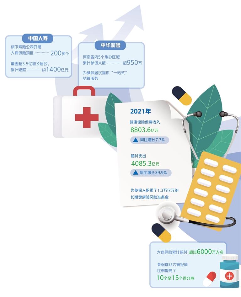 中国人寿作为行业内首批开展大病保险业务的公司,其旗下寿险公司开展大病保险项目200多个,覆盖超过3.5亿城乡居民,累计赔款约1400亿元。其中2021年中国人寿大病保险业务赔付1400万人次超过250亿元医疗费用,成为基本医疗保险的重要补充。中国人寿集团董事长白涛表示,将继续努力把经济社会和人民群众面临的各类风险转化为可保风险,拓宽管理的“不确定性”范围,提升风险管理能力,在健康险领域不断创新保险产品服务,积极覆盖更广大人群和区域,增强经济社会韧性,助力各地政府部门织密民生保障网。