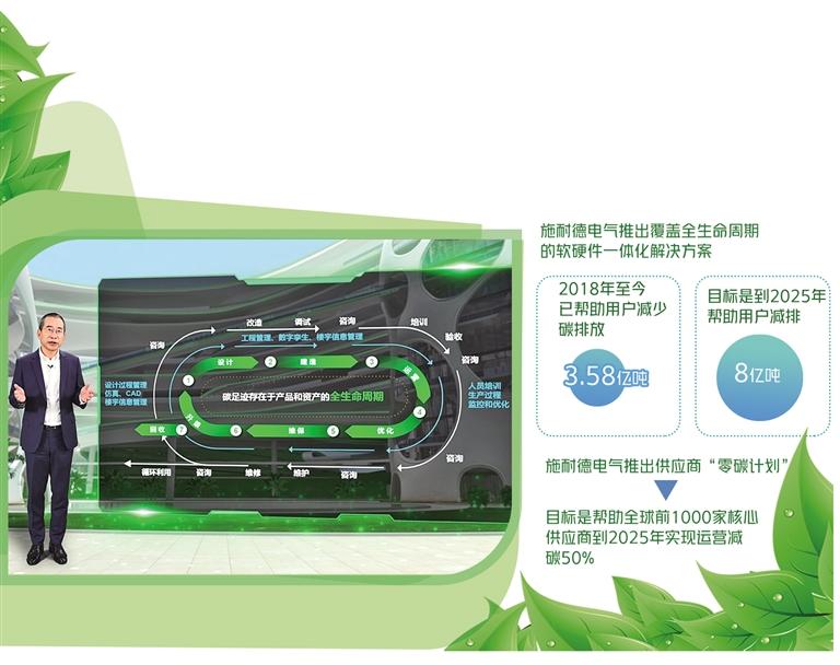 尹正介绍说,施耐德电气推出了覆盖全生命周期的软硬件一体化解决方案,目前已有不少行业用户投入使用,2018年至今已帮助用户减少3.58亿吨碳排放。根据施耐德电气的目标,到2025年将帮助用户减排8亿吨。