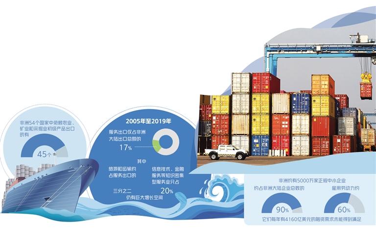 一是挖掘知识密集型服务业增长潜力。贸发会议数据显示,2005年至2019年,非洲服务贸易水平较低,服务出口仅占非洲大陆出口总额的17%。而且非洲的服务出口以低附加值交易为主,其中旅游和运输约占服务出口的三分之二,信息技术、金融服务等知识密集型服务业只占非洲服务出口的20%,仍有巨大增长空间。