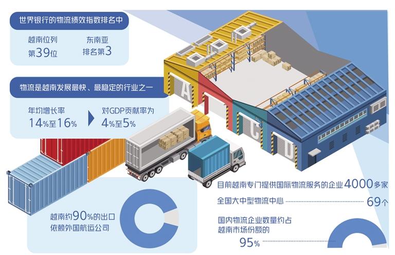物流产业在促进越南经济发展方面发挥着重要作用,为提高越南经济竞争力作出重要贡献,是国民经济的重要产业。在世界银行的物流绩效指数排名中,越南在160个国家中位列第39位,在东南亚排名第3。物流也是越南发展最快、最稳定的行业之一,年均增长率为14%至16%,对GDP的贡献率为4%至5%。凭借位于亚太地区重要位置的优势,随着新冠肺炎疫情基本得到控制、生产经营活动呈现强劲反弹势头,越南物流市场发展面临广阔前景。