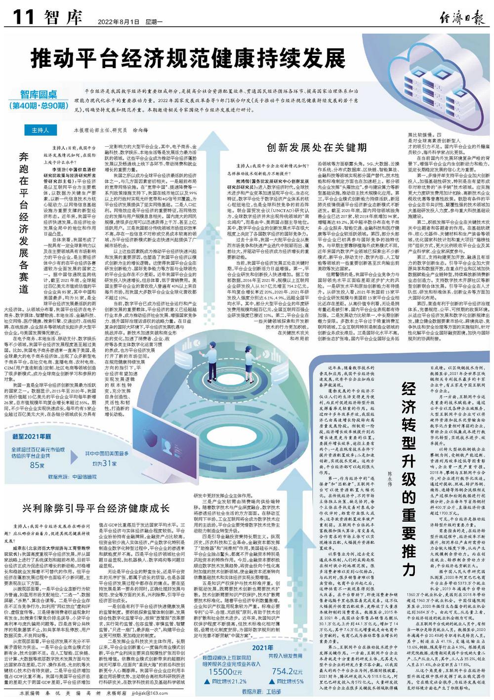平台经济是我国数字经济的重要组成部分,是提高全社会资源配置效率、贯通国民经济循环各环节、提高国家治理体系和治理能力现代化水平的重要推动力量。2022年国家发展改革委等9部门联合印发《关于推动平台经济规范健康持续发展的若干意见》,明确坚持发展和规范并重。本期邀请相关专家围绕平台经济发展进行研讨。