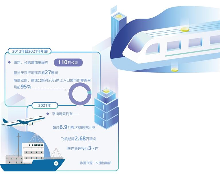 另一方面,服务能力与水平持续增强。我国铁路客运周转量、货运发送量、货运周转量、运输密度均居世界第一位。以国家高速公路为主体的高速公路网络已经覆盖了98.8%的城区人口20万以上城市及地级行政中心,连接了全国约88%的县级行政区和约95%的人口。航空服务网络覆盖全国92%的地级行政单元、88%的人口、93%的经济总量。2021年,我国平均每天有超过6.9万艘次船舶进出港,飞机起降2.68万架次,快件处理接近3亿件。