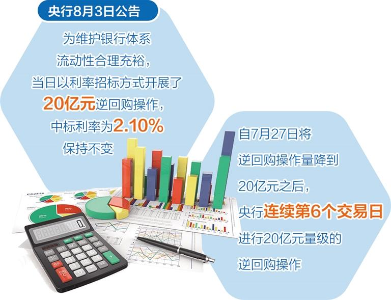 小量逆回购还在持续。人民银行8月3日公告称,为维护银行体系流动性合理充裕,当日以利率招标方式开展了20亿元逆回购操作,中标利率为2.10%,保持不变。由于3日有20亿元逆回购到期,人民银行当日公开市场实现零投放零回笼。