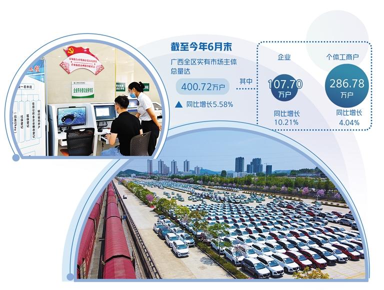 近年来,广西以商事登记改革为抓手,构建市场准入新标准,借助一流营商环境加快推动统一大市场建设,稳步提升了市场准入效能。通过“准入准营”改革、公平竞争等措施的推进,全区市场主体运行总体平稳,稳中有进。截至今年6月末,广西全区实有市场主体突破400万大关,市场主体总量达400.72万户,同比增长5.58%,实现历史性跨越。其中,企业107.70万户、个体工商户286.78万户,同比分别增长10.21%和4.04%。
