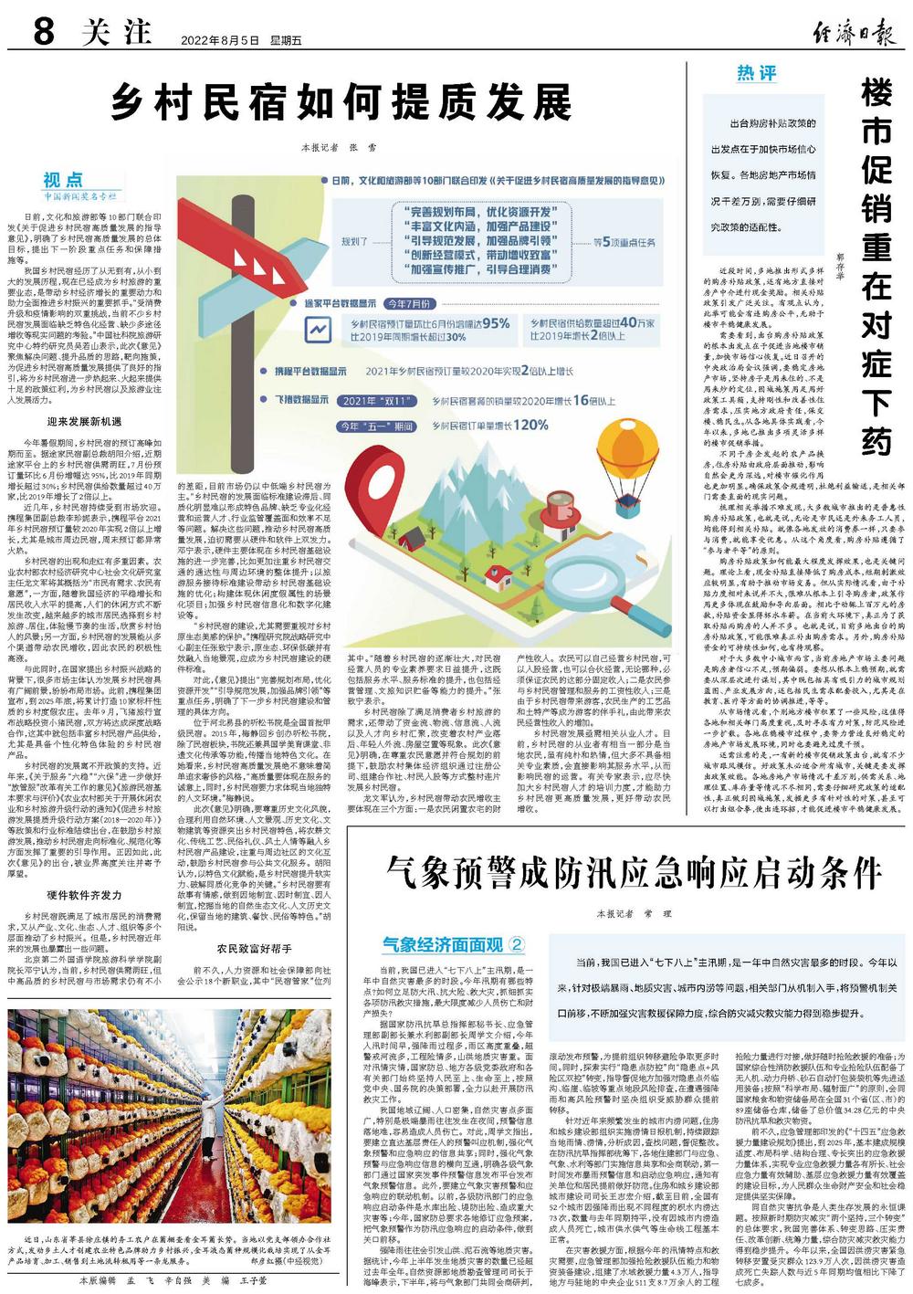 我国乡村民宿经历了从无到有,从小到大的发展历程,现在已经成为乡村旅游的重要业态,是带动乡村经济增长的重要动力和助力全面推进乡村振兴的重要抓手。“受消费升级和疫情影响的双重挑战,当前不少乡村民宿发展面临缺乏特色化经营、缺少多途径增收等现实问题的考验。”中国社科院旅游研究中心特约研究员吴若山表示,此次《意见》聚焦解决问题、提升品质的思路,靶向施策,为促进乡村民宿高质量发展提供了良好的指引,将为乡村民宿进一步热起来、火起来提供十足的政策红利,为乡村民宿以及旅游业注入发展活力。