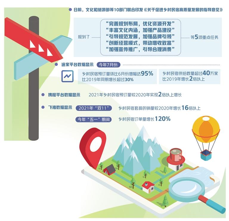 日前,文化和旅游部等10部门联合印发《关于促进乡村民宿高质量发展的指导意见》,明确了乡村民宿高质量发展的总体目标,提出下一阶段重点任务和保障措施等。