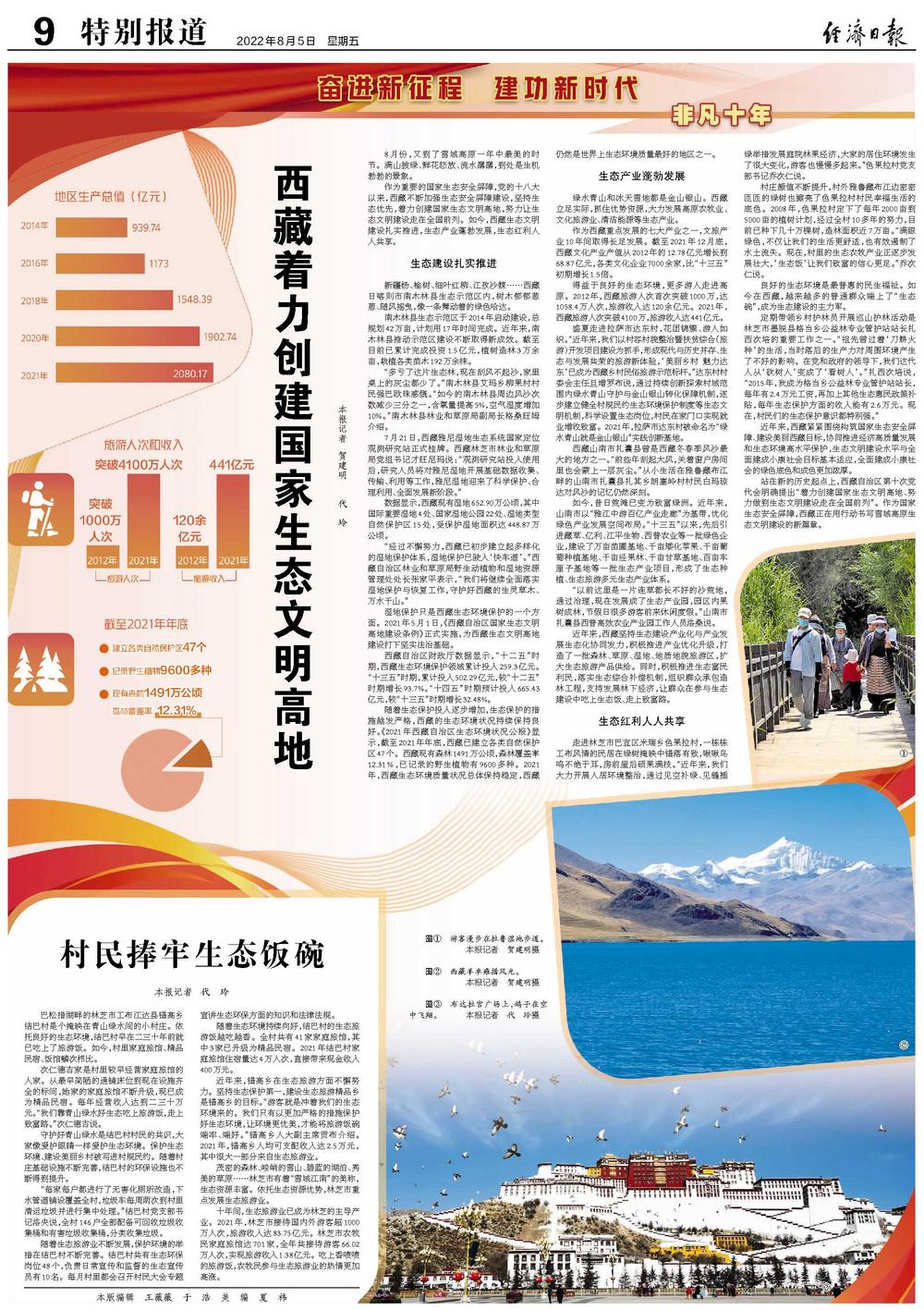 得益于良好的生态环境,更多游人走进高原。2012年,西藏旅游人次首次突破1000万,达1058.4万人次,旅游收入达120余亿元。2021年,西藏旅游人次突破4100万,旅游收入达441亿元。