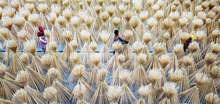8月5日,江西省分宜县洋江镇一家竹制品公司的员工在晾晒毛竹半成品。近年来,分宜县发挥毛竹资源丰富的优势,大力发展毛竹深加工产业,积极吸引农民在家门口就业,带动农民致富增收。徐 云摄(中经视觉)