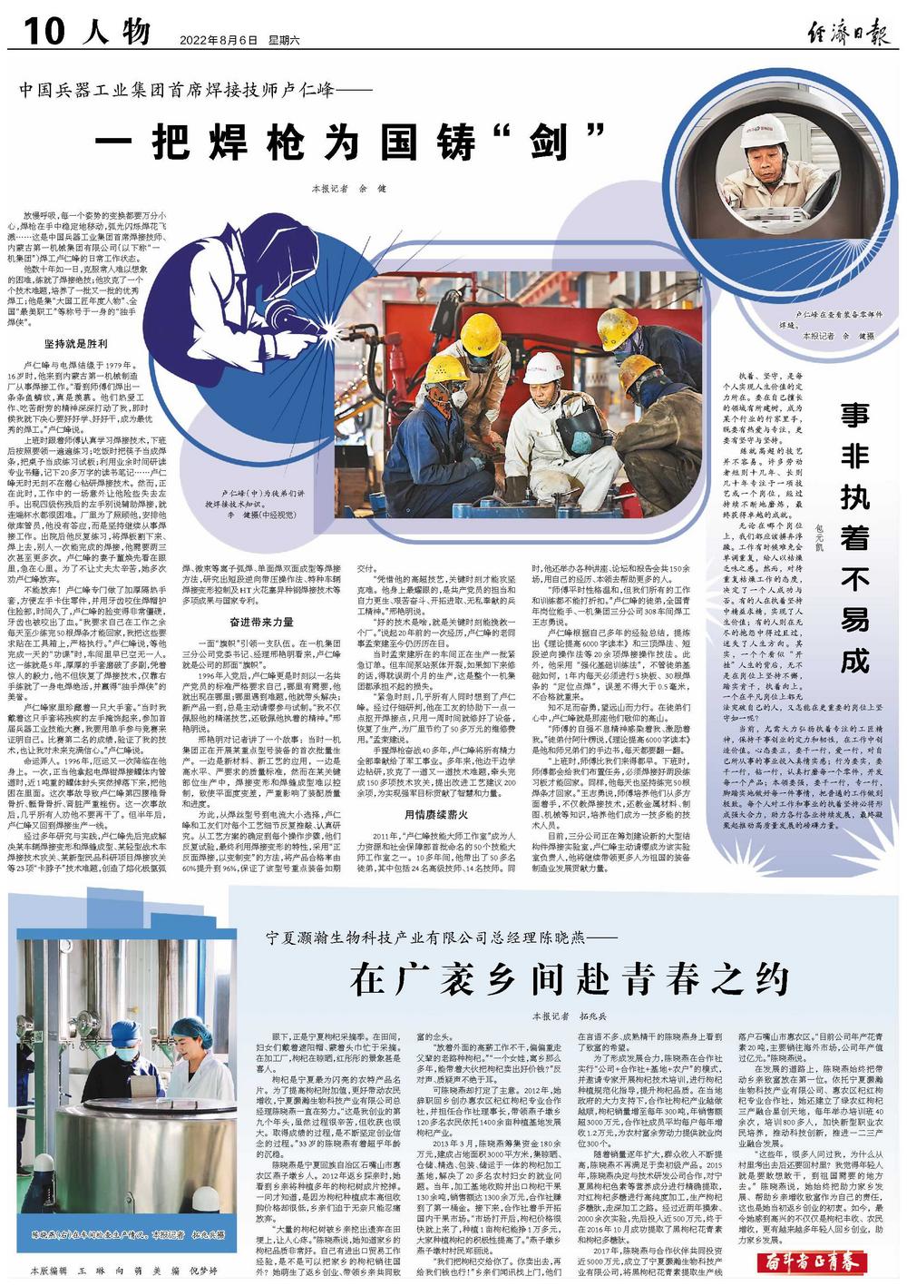 上班时跟着师傅认真学习焊接技术,下班后按照要领一遍遍练习;吃饭时把筷子当成焊条,把桌子当成练习试板;利用业余时间研读专业书籍,记下20多万字的读书笔记……卢仁峰无时无刻不在潜心钻研焊接技术。然而,正在此时,工作中的一场意外让他险些失去左手。出现四级伤残后的左手别说辅助焊接,就连端杯水都很困难。厂里为了照顾他,安排他做库管员,他没有答应,而是坚持继续从事焊接工作。出院后他反复练习,将焊板割下来、焊上去,别人一次能完成的焊接,他需要两三次甚至更多次。卢仁峰的妻子董焕先看在眼里,急在心里。为了不让丈夫太辛苦,她多次劝卢仁峰放弃。