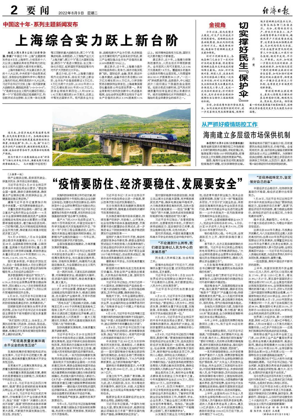 龚正介绍,这十年,上海着力建设现代化经济体系,综合实力跃上新台阶,全市生产总值连续跨过3万亿元、4万亿元两个大台阶,从2012年的2.13万亿元增长到2021年的4.32万亿元,跻身全球城市第四位;人均GDP从1.42万美元增加到2.69万美元,达到上中等发达国家水平。现代服务业为主体、战略性新兴产业为引领、先进制造业为支撑的现代产业体系初步形成,第三产业增加值占全市生产总值的比重从60%提高到73%以上。