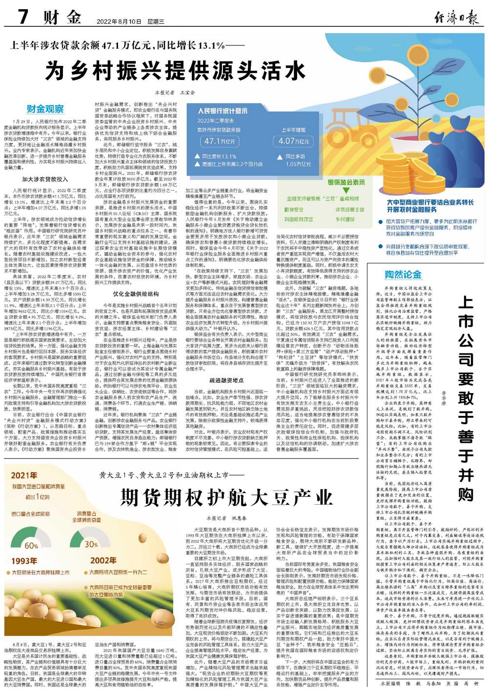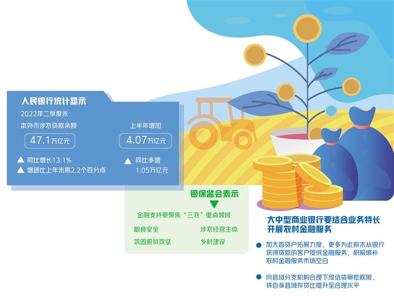人民银行统计显示,2022年二季度末,本外币涉农贷款余额47.1万亿元,同比增长13.1%,增速比上年末高2.2个百分点;上半年增加4.07万亿元,同比多增1.05万亿元。