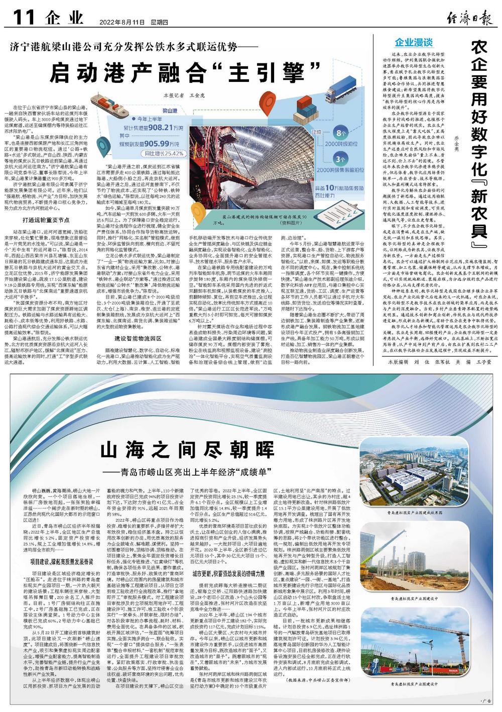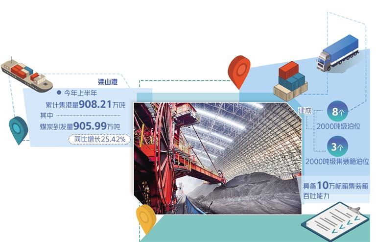“梁山港是山东煤炭保障供应的主力军,也是连接西部煤源产地和长江三角洲地区的重要港口物流枢纽。通过‘公路+铁路+水运’多式联运,产自山西、陕西、内蒙古等地的煤炭从瓦日铁路运到梁山港,再通过京杭大运河运往南方。”济宁港航梁山港有限公司党委书记、董事长陈哲说,今年上半年,梁山港累计集港量达900多万吨。