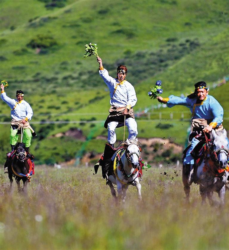 ②四川省阿坝藏族羌族自治州红原县马术队在草原上为游客表演节目。