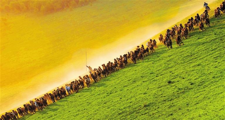 ①内蒙古赤峰市克什克腾旗乌兰布统牧民在草原上放牧。