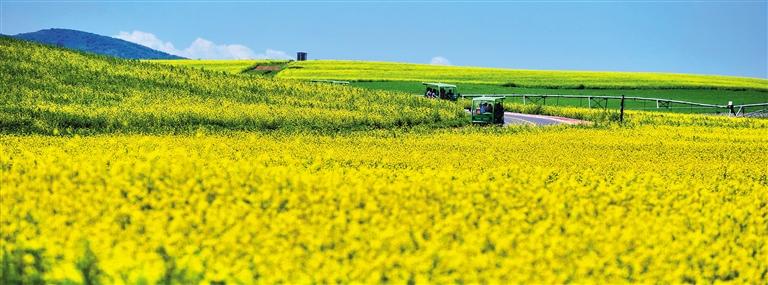 ⑤游客乘坐观光车在河北省承德市坝上“一号风景大道”花海欣赏美景。陈琦嘉摄(中经视觉)